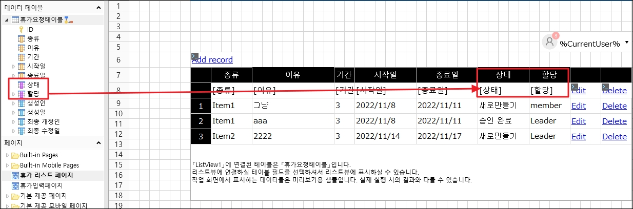워크플로우를 설정하면 테이블에 상태,할당 정보가 추가됩니다. 해당 정보를 리스트뷰에 사용할 수 있습니다.
