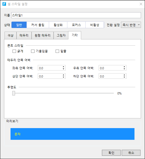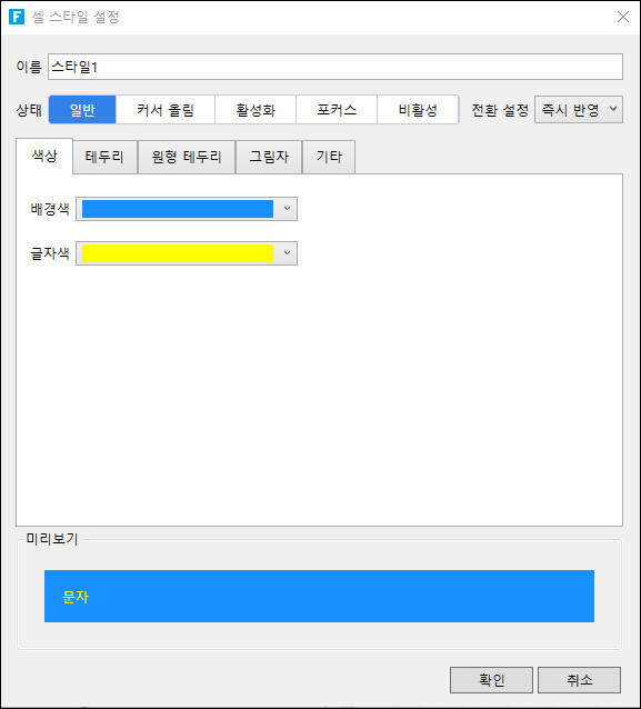 ![](https://help.grapecity.com.cn/download/thumbnails/72352836/%E6%AD%A5%E9%AA%A44.png?version=1\&modificationDate=1648092537000\&api=v2) 일반, 커서올림, 활성화, 포커스, 비활성화 및 다른 상태 간에 전환할 때 전환 애니메이션의 길이를 포함하여 각 상태에서 셀의 스타일을 지정합니다.