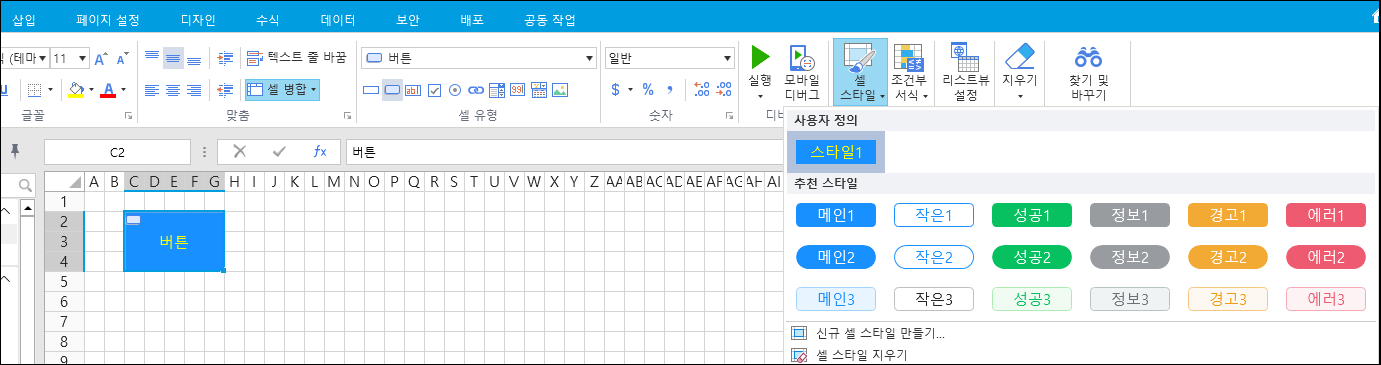 ![](https://help.grapecity.com.cn/download/thumbnails/72352836/%E6%AD%A5%E9%AA%A45.png?version=1\&modificationDate=1648092537000\&api=v2) \[확인]을 클릭하면 버 셀에 스타일이 적용되고 \[셀 스타일]을 클릭하면 스타일 목록 맨 위에 사용자 지정 스타일이 나열됩니다.