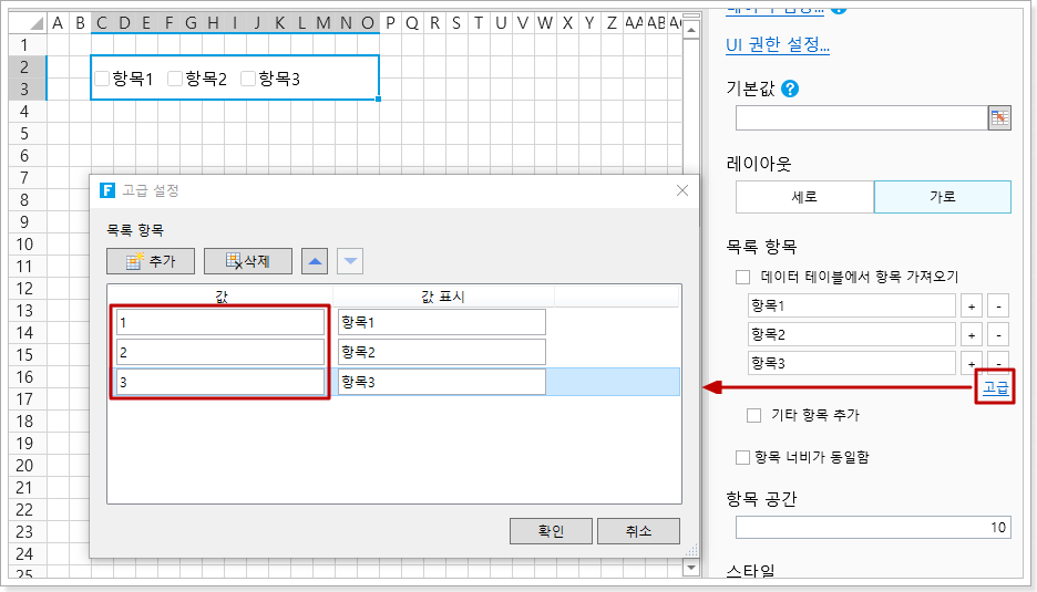 체크박스의 값을 표시 텍스트와 다르게 결합하려면 고급 설정을 클릭하여 설정할 수 있습니다.