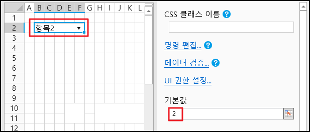 * 기본값을 \[2]로 설정하면 콤보 상자에서 \[항목2]가 선택됩니다.
