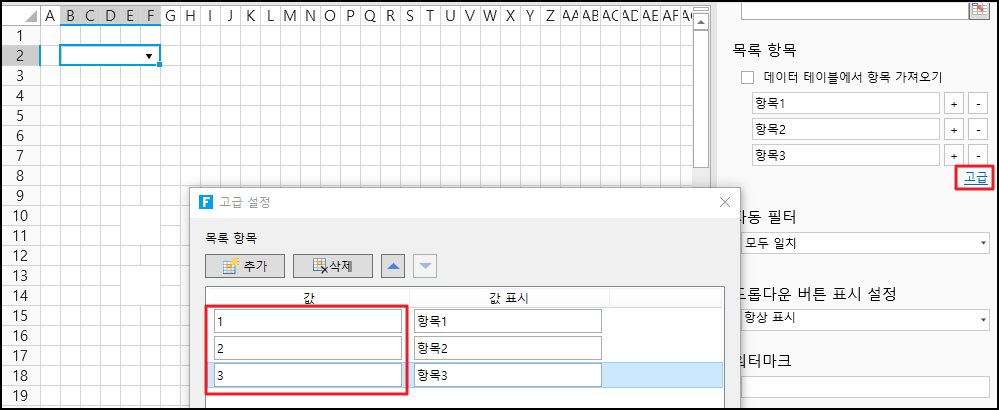 고급 설정에서 항목의 값을 표시 텍스트, 항목 정렬과 함께 설정할 수 있습니다.