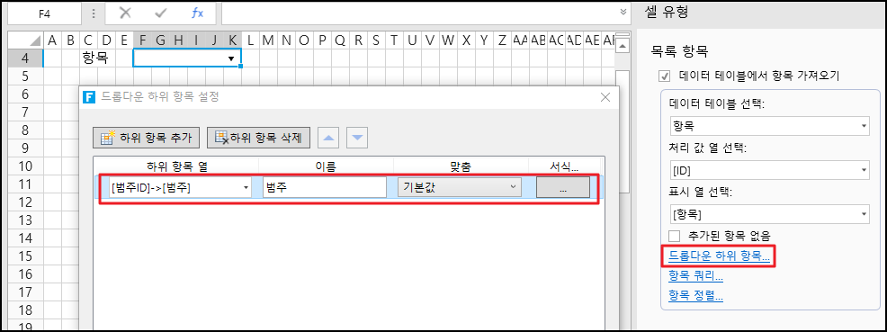 서식: 하위 필드의 셀 서식을 지정합니다.
