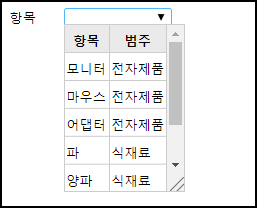 실행 후 콤보 상자에 카테고리가 의류와 같은 항목을 쿼리하여 다음과 같이 표시합니다.