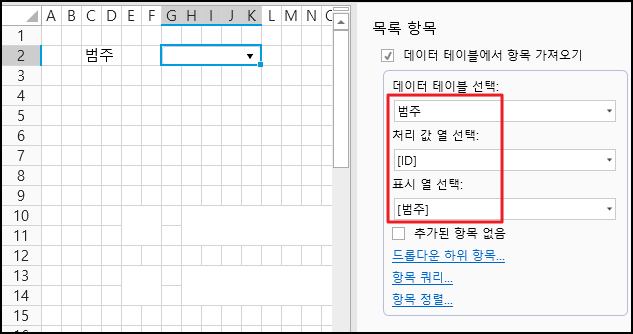 콤보 상자의 셀 설정에서 체크박스를 설정해야 하는 항목에서 [데이터 테이블에서 항목 가져오기]를 선택한 후 데이터베이스의 데이터 생성 콤보 상자의 항목을 선택할 수 있습니다.