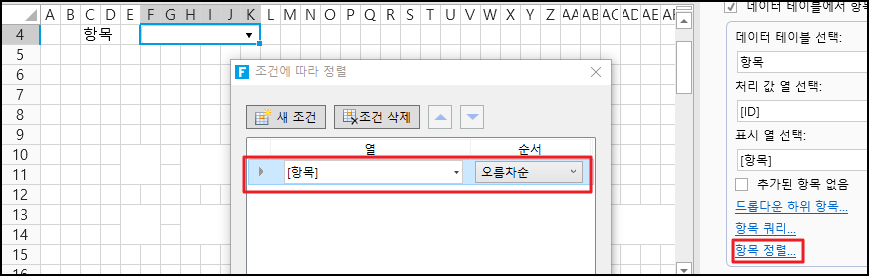 다음 그림과 같이 항목 정렬을 클릭하여 정렬 기준을 설정하고 필드를 ID로 설정하고 내림차순으로 정렬합니다.