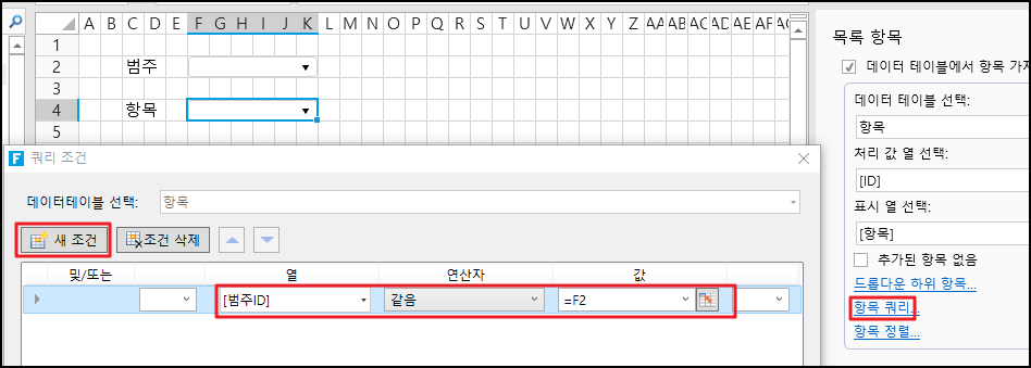 범주 ID에 따라 제품 이름을 표시하려면 필드가 범주 ID를 선택하고, 작업 선택이 같음을 선택하고, 값이 첫 번째 콤보 상자가 있는 셀을 선택하기 때문에 새 조건을 만듭니다.