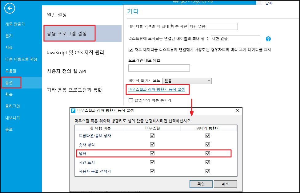 마우스 휠과 키보드 위/아래 키를 사용하여 날짜 셀의 값을 수정할 수 있는지 여부를 설정할 수 있습니다.
