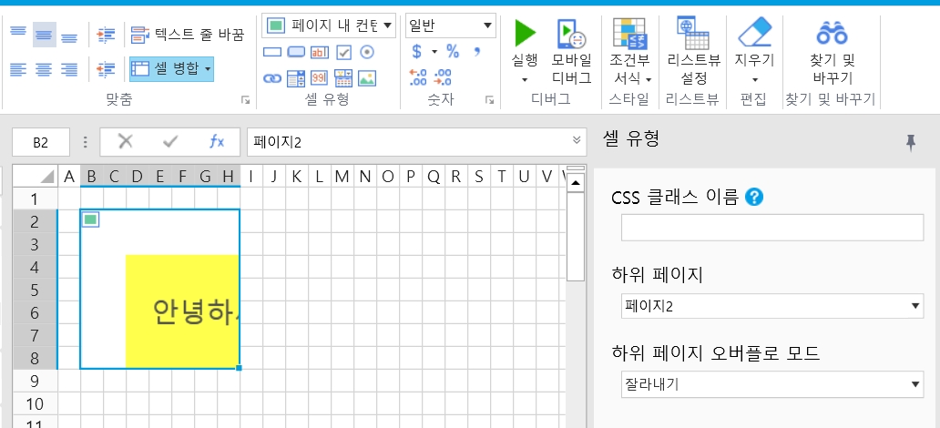 서브 페이지를 설정한 후 페이지 컨테이너 셀을 더블 클릭하여 편집할 서브 페이지를 바로 엽니다.