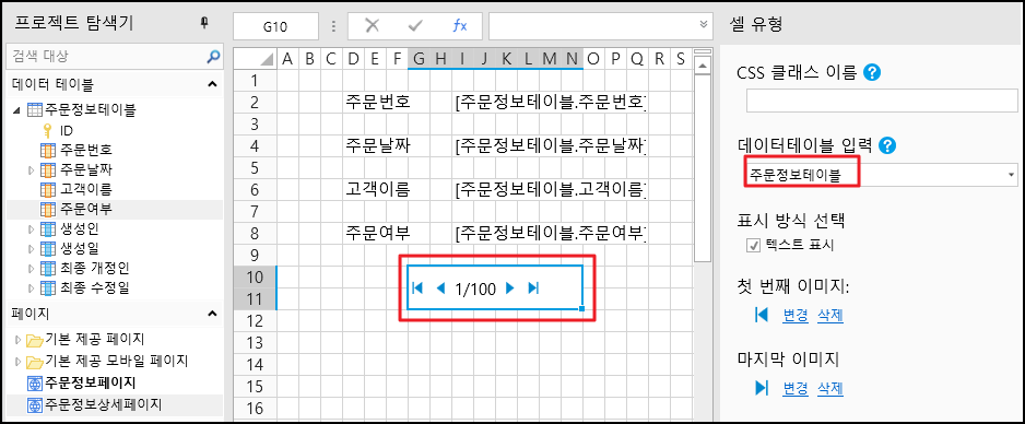 세부 정보 페이지에서 셀 범위를 선택하고 셀 유형을 페이지네비게이션으 설정하고 탐색 테이블을 다음 그림과 같이 주문 정보테이블로 설정합니다.