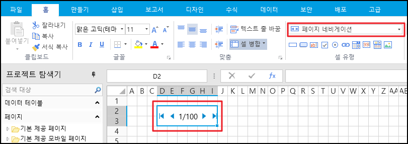 * **페이지 네비게이션은 셀 값을 사용하지 않으므로 수식이나 데이터 바인딩을 사용하지 않습니다.**