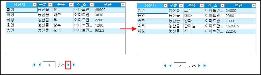 실행 후 목록 페이지에서 테이블당 5줄의 레코드만 표시되고 다음 아이콘을 클릭하면 테이블에 다음 페이지의 데이터가 표시됩니다.
