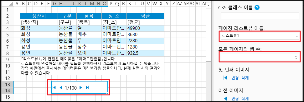 | 모든 페이지의 행 수         | 한 페이지에 표시할 레코드 행 수를 설정합니다.                                                                                                                                                                                                                                                                                                                                                                                                                                                                                          |