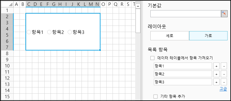 | 기본값         | 라디오 버튼의 기본값을 지정합니다. 수식을 입력하면 수식의 결과가 기본값으로 사용됩니다.                                                                                |