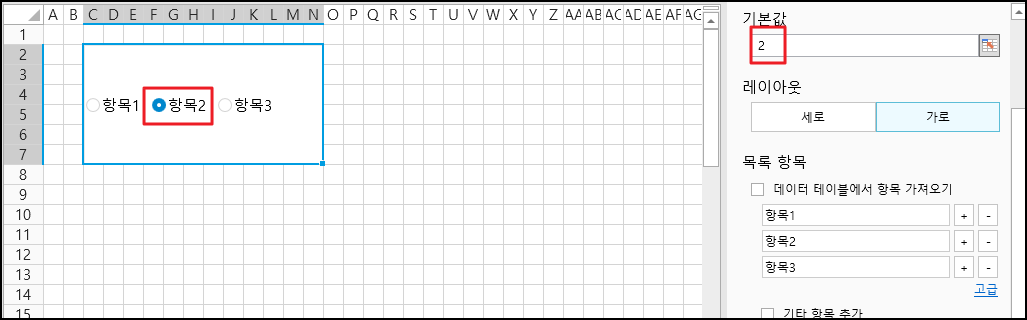 * 기본값을 \[2]로 설정하면 라디오 버튼의 \[항목2]가 선택됩니다.