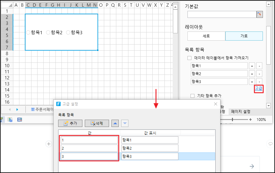 라디오 버튼의 값이 표시되는 텍스트와 다른 경우 고급 설정을 클릭하여 설정할 수 있습니다.