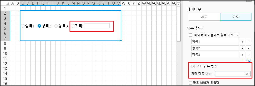 | 레이아웃        | <p>라디오 버튼의 배치 방향을 지정합니다.</p><ul><li>세로 : 하위 항목에 표시할 열 수를 설정하려면 선택합니다.</li><li>가로 : 선택한 후 각 항목의 너비를 동일하게 할지 여부를 설정합니다.</li></ul>  |