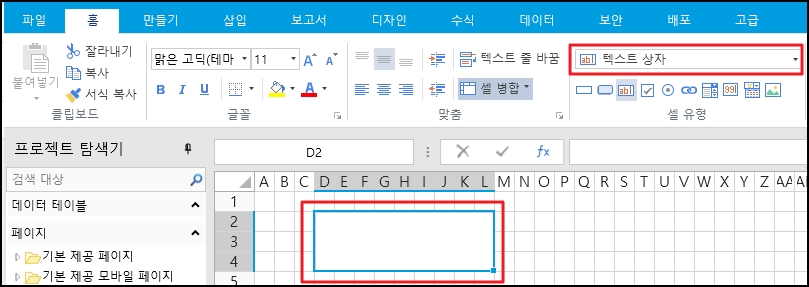 텍스트 상자를 선택하고 속성 설정 영역에서 셀 설정 탭을 선택합니다.