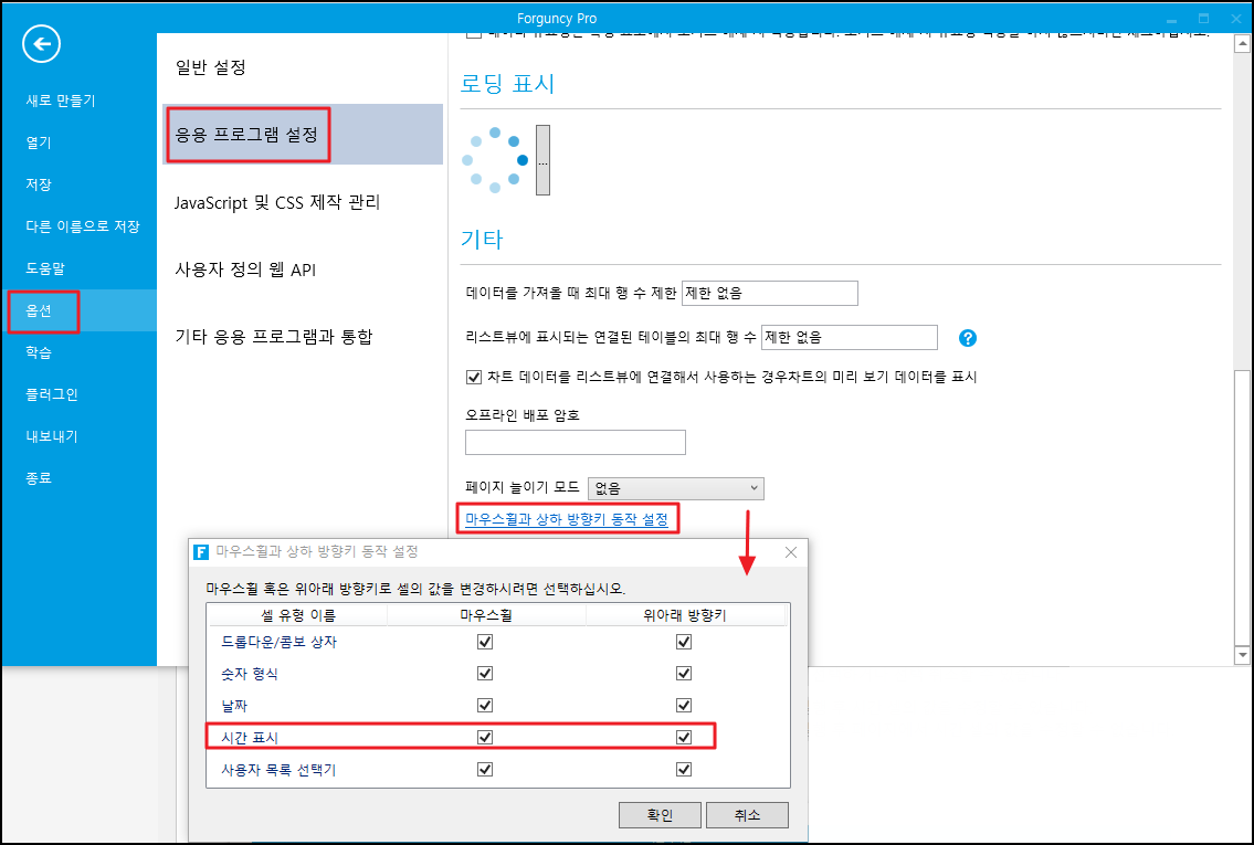 리본 메뉴에서 파일을 선택한 다음 옵션-> 응용 프로그램 설정을 선택하고 동작 설정 영역에서 \[마우스 휠과 상하 방향키 동작 설정] 하이퍼링크를 클릭하여 대화 상자를 팝업합니다.