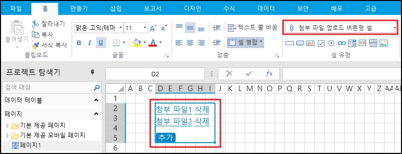 첨부 파일 업로드 버튼형을 선택하고 속성 설정 영역에서 셀 설정 탭을 선택합니다.
