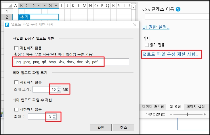 업로드된 파일의 확장명, 크기 및 수를 구성합니다.