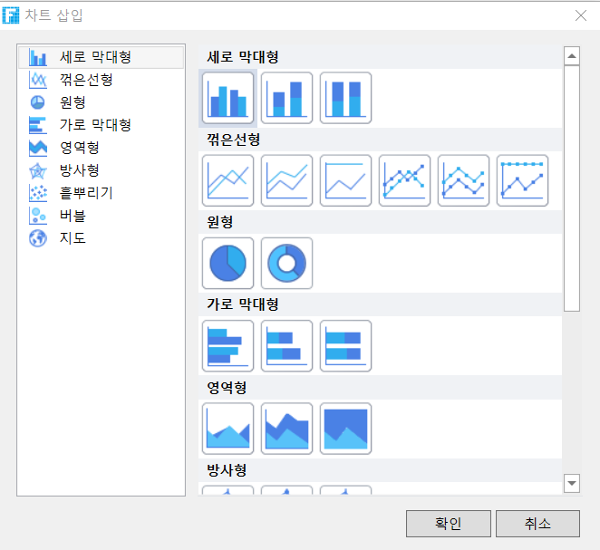 포건시는 차트 유형으로 세로 막대형, 꺽은선형, 원형, 가로 막대형, 영역형, 방사형, 흩뿌리기, 버블, 지도 지원합니다.