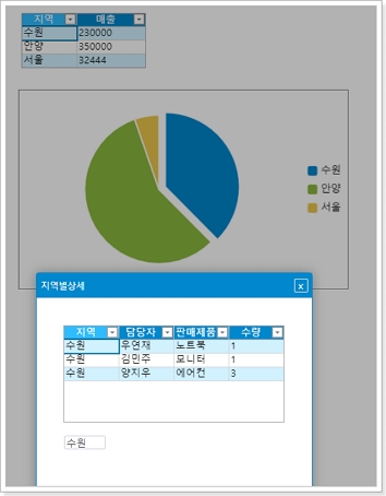 원형 차트의 다른 영역을 클릭하면 해당 지역의 해당 지역에 대한 판매 세부 정보가 나타납니다.