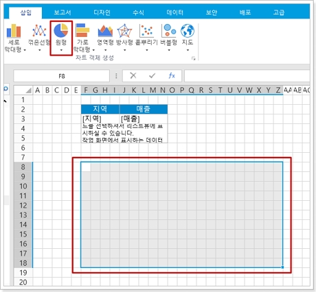리스트뷰 선택하고 리본 메뉴에서 [삽입]>[원형] 을 선택하고 원형 차트를 클릭하여 원형차트를 삽입합니다.