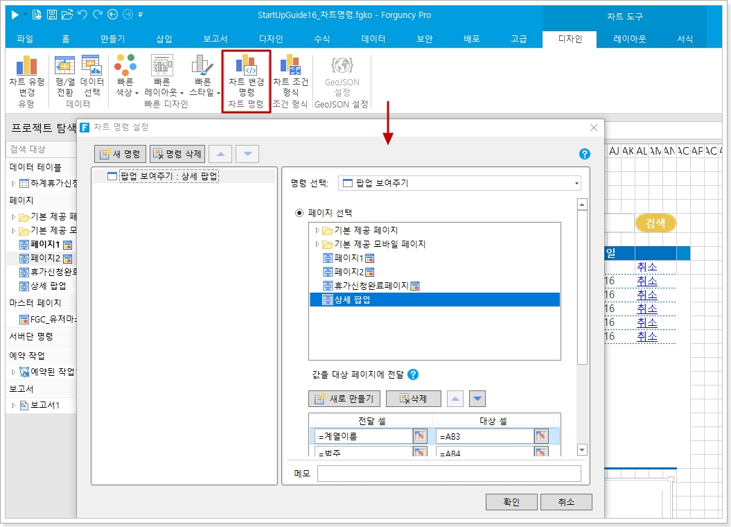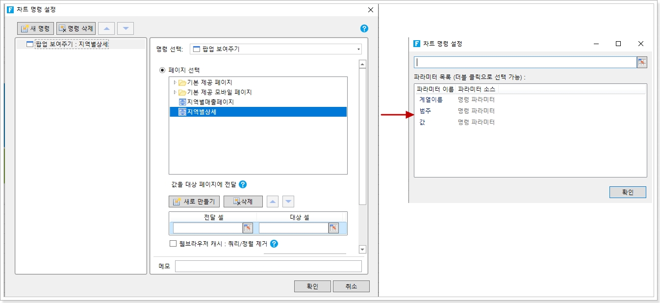 차트 명령 설정 대화 상자에서 [팝업 페이지]로 명령을 선택하고 페이지를 [지역별상세페이지]로 선택하고 고급 설정을 수행합니다.