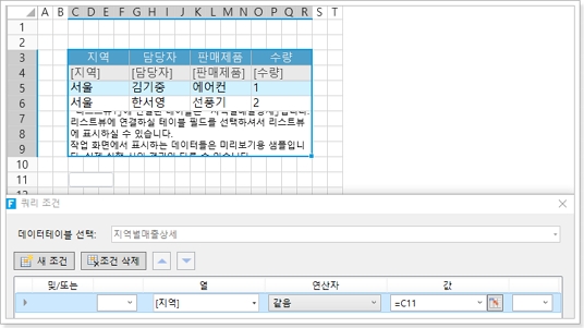 세부 정보 페이지에서 영역이 C11의 값과 같을 때 테이블에 대한 쿼리 조건을 설정합니다. 10행 셀 설정을 숨깁니다.