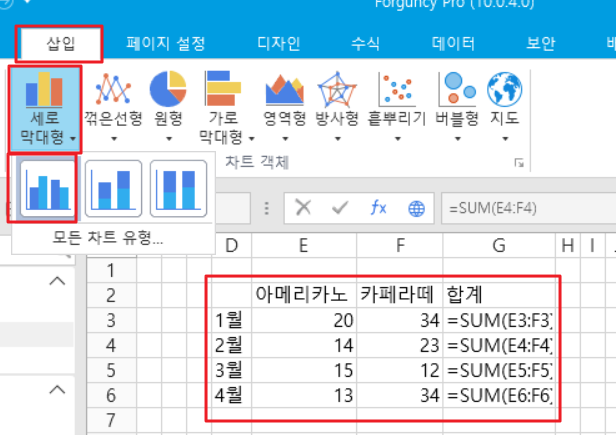 1. 차트 데이터의 소스가 되는 데이터 영역을 선택하고, 리본 메뉴바에서 "삽입->세로막대형차트"를 선택한 후 막대차트 종류를 선택합니다. 예를 들어 묶은 세로 막대형 차트를 선택하세요.