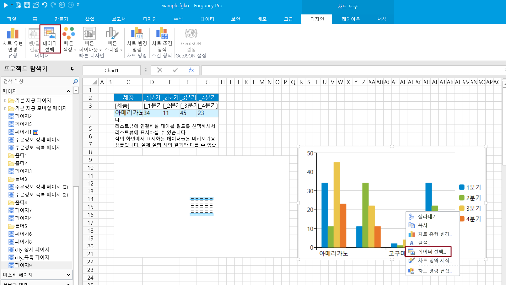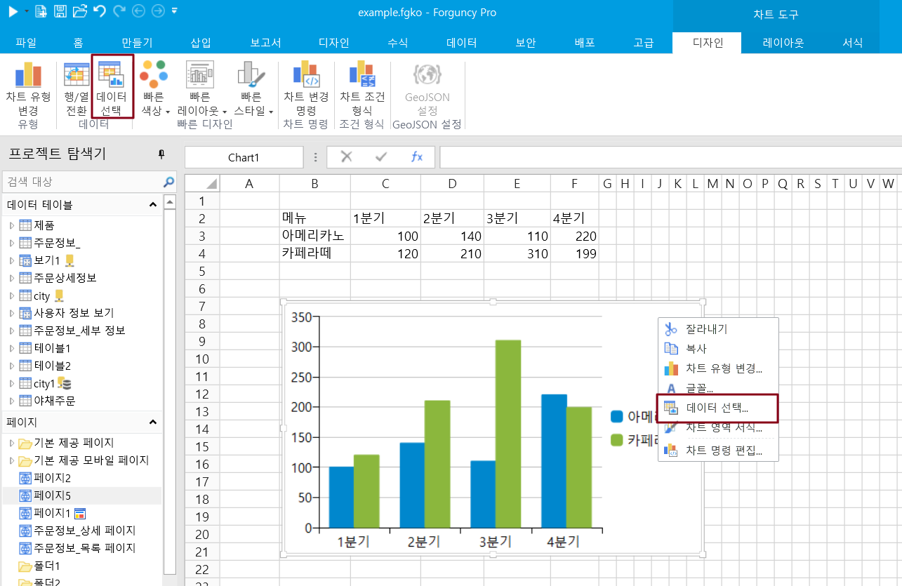 셀을 데이터 원본으로 사용하는 경우 포건시의 차트 작업은 Excel의 작업과 거의 동일합니다.