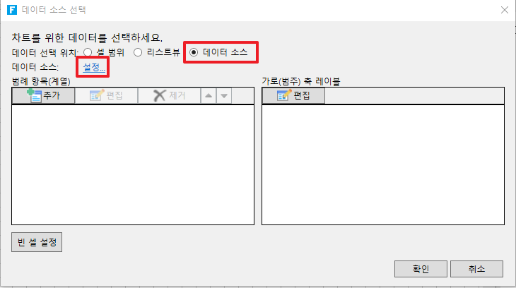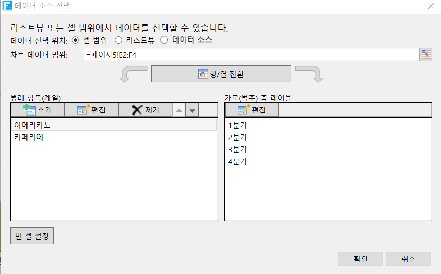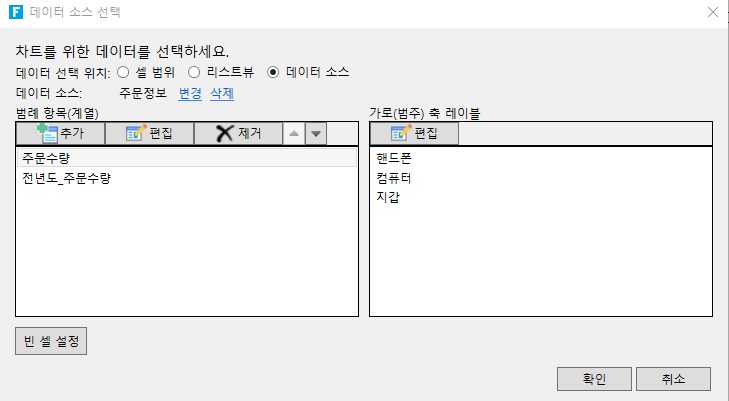 범례 항목(계열): 범례 항목(계열)을 추가, 수정, 삭제, 위아래로 이동, 데이터 테이블을 데이터 소스로 사용하는 경우 데이터 소스의 한 열만 계열 데이터로 선택할 수 있습니다.
