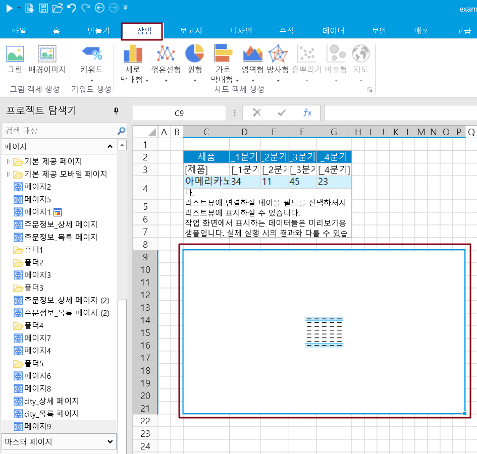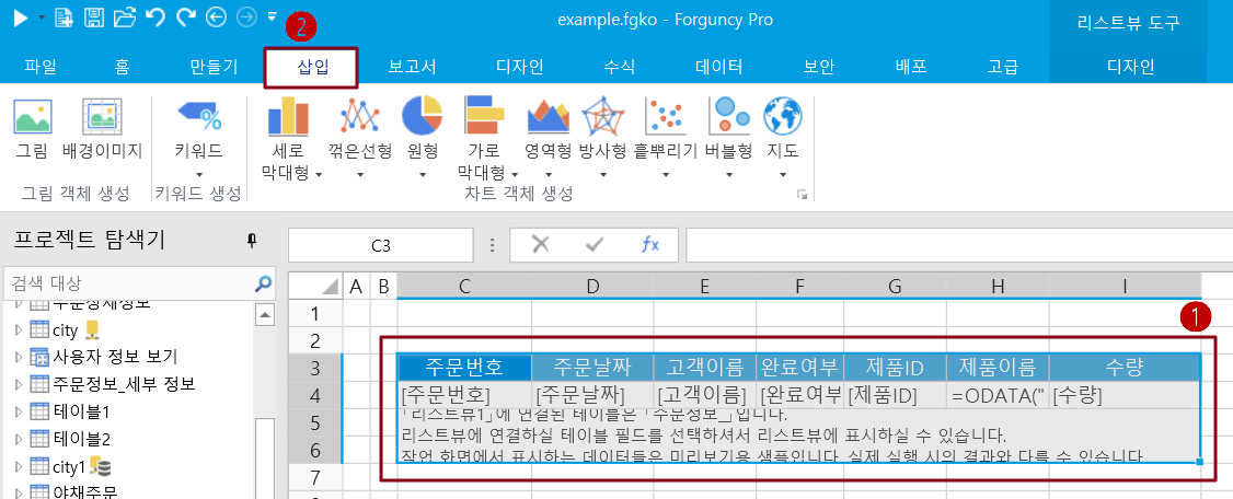 리스트뷰를 데이터 원본으로 사용하려면 먼저 페이지에 테이블과 필드가 이미 바인딩되어 있어야 하며 테이블 영역을 데이터 원본으로 선택한 다음 리본 메뉴 모음에서 [삽입]을 선택해야 합니다.