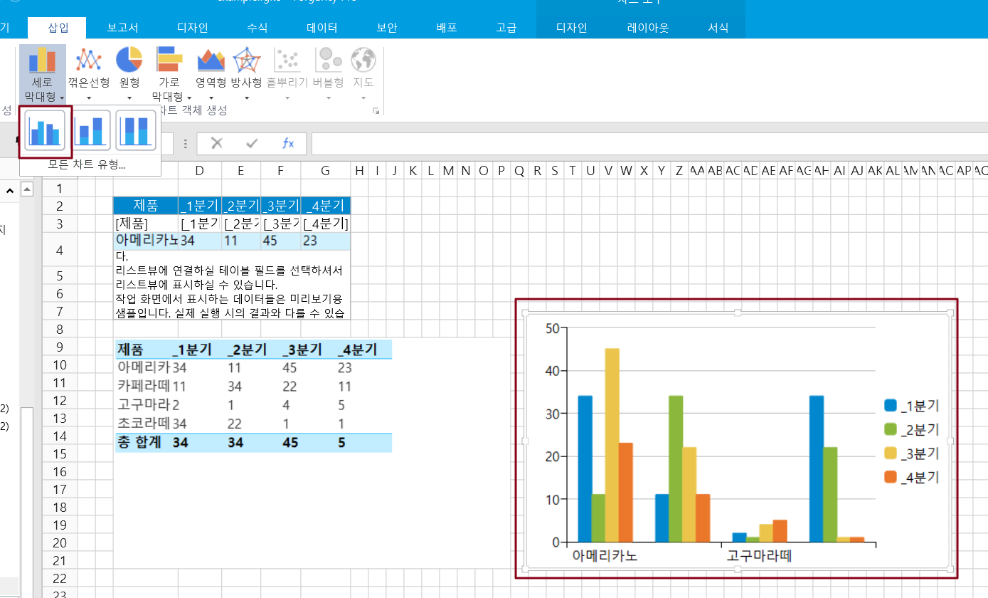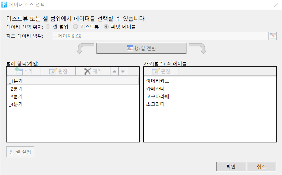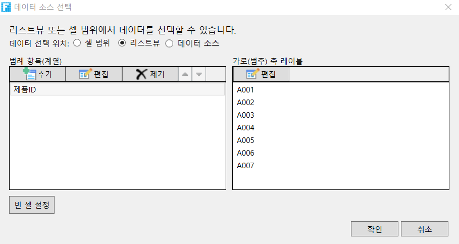 셀과 리스트뷰로및 데이터테이블을 데이터소스로 선택할 때 가로 및 세로 축에는 몇 가지 차이점이 있습니다.