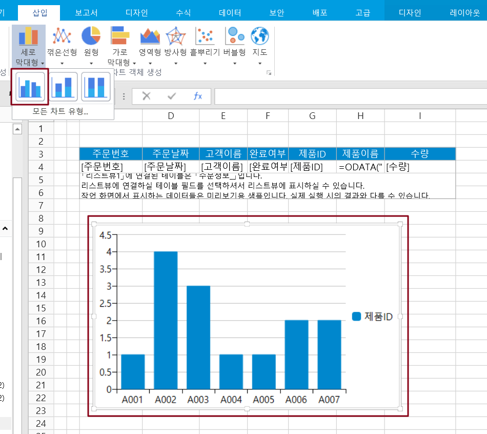 차트를 삽입할 때 선택할 수 있는 방법은 네가지 데이터 원본(셀 데이터, 리스트뷰, 데이터테이블 및 피벗 테이블 데이터)이 있습니다.