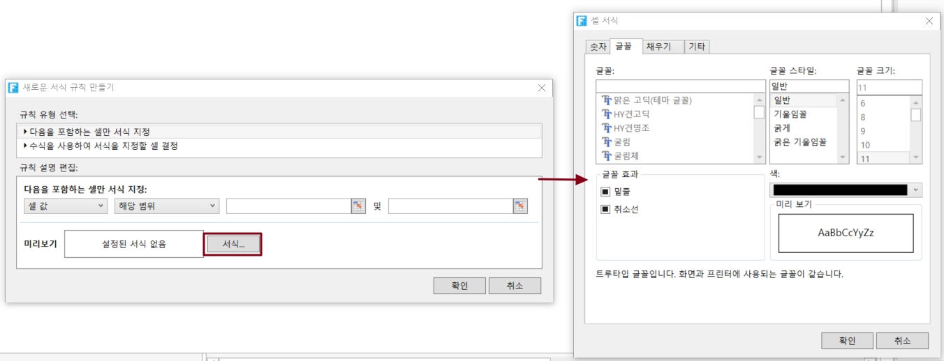 조건부 서식을 선택하고 [새 규칙]을 클릭하고 팝업 새 서식 규칙 대화 상자에서 조건을 설정하고 [서식]을 클릭하여 조건을 충족하는 셀의 서식을 지정합니다.