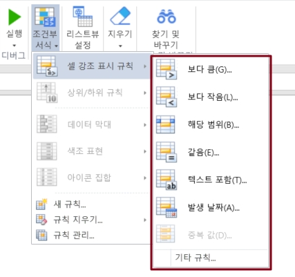 조건부 서식을 지정할 셀을 선택하고 리본 메뉴 모음에서 [홈]>[ 조건부 서식]을 선택합니다.