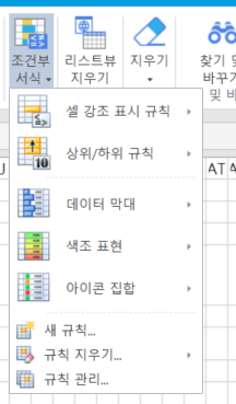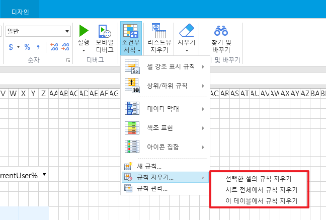 규칙지우기를 선택하면 "선택한 셀의 규칙 지우기", "시트 전체에서 규칙 지우기", "이 테이블에서 규칙 지우기"를 할 수 있습니다.