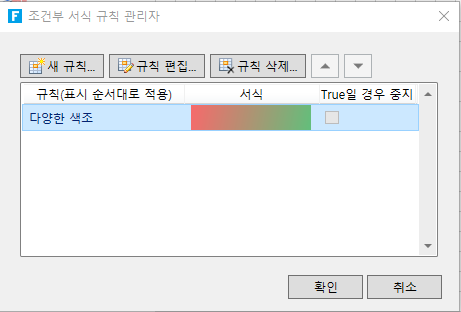 "규칙 관리"를 클릭하면 팝업되는 조건부 서식 규칙 관리자에서 규칙을 생성, 편집 및 삭제할 수 있습니다.