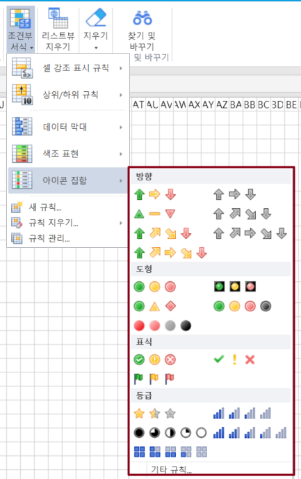 아이콘 집합을 사용하여 데이터에 주석을 달고 임계값별로 데이터를 3~5개의 범주로 분류할 수 있습니다. 각 아이콘은 값의 범위를 나타냅니다. 예를 들어 3방향 화살표 아이콘 집합에서 녹색 위쪽 화살표는 더 높은 값을 나타내고, 노란색 가로 화살표는 중간 값을 나타내고, 빨간색 아래쪽 화살표는 낮은 값을 나타냅니다.