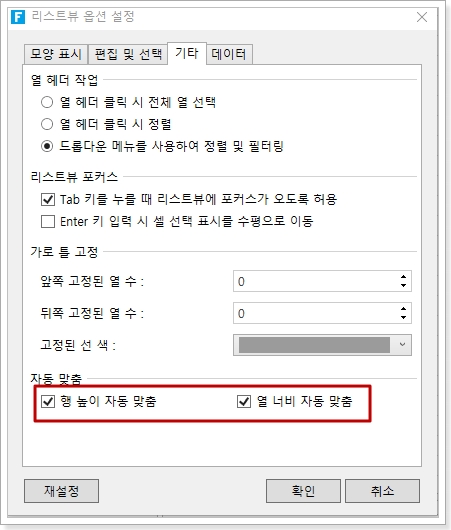 리스트뷰를 선택하고 마우스 오른쪽 버튼을 클릭하고 마우스 오른쪽 버튼 메뉴에서 [리스트뷰 옵션 설]을 선택하고 리스트뷰 설정 대화 상자를 표시하고 [기타 동작] 탭에서 가변 행 높이 및 열 너비를 설정합니다.