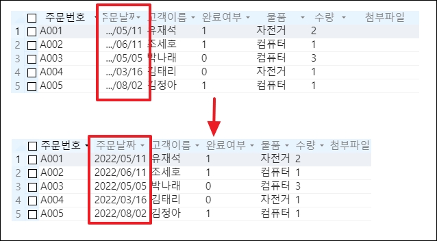 열 너비 자동 맞춤 선택하면 리스트뷰의 주문날짜 열 너비가 넓어집니다.