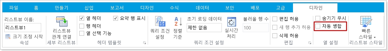 전체 리스트뷰에 대해 자동 병합을 설정하거나 열에 자동 병합을 설정할 수 있습니다.