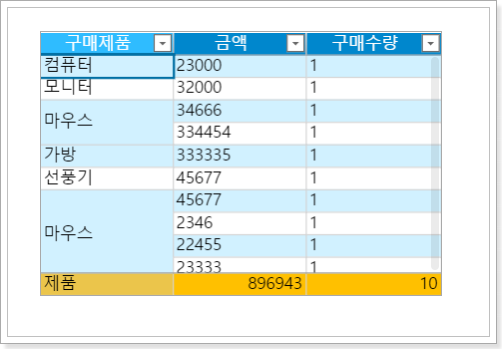 리스트뷰를 선택하고 리본의 리스트뷰 도구-디자인-열 설정 영역에서 자동 병합을 선택하면 자동으로 병합된 개체가 전체 테이블입니다.
