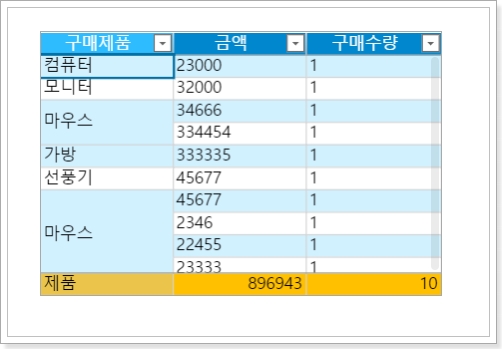 예를 들어 리스트뷰를 선택한 후 자동 병합을 선택하면 첫 번째 열에 인접한 행과 동일한 값의 셀이 병합된 것을 볼 수 있습니다.