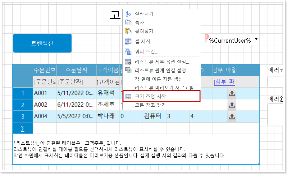 리스트뷰의 마우스 오른쪽 버튼을 클릭하고 마우스 오른쪽 버튼을 클릭 메뉴에서 [크기 조정 시작]을 선택하고 파란색 와이어프레임의 네 모서리를 드래그하여 리스트의 크기와 위치를 수정하고 조정이 완료되면 다른 영역을 클릭하여 조정을 종료할 수도 있습니다.