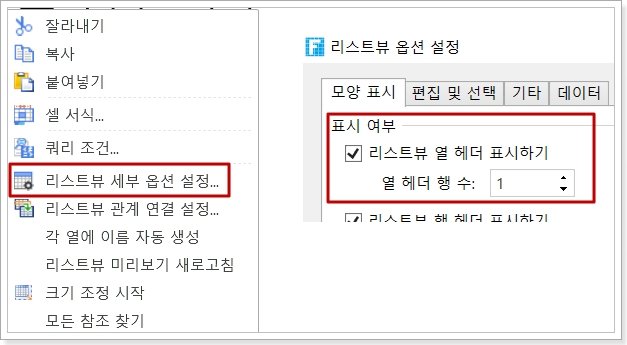 리스트뷰 선택하고 마우스 오른쪽 버튼을 클릭하고 [모양표시]를 선택하고 "리스트뷰 열 헤더 표시하기"를 선택하면 열 헤더 행수를 1보다 큰 숫자를 다중 행 헤더로 설정합니다.