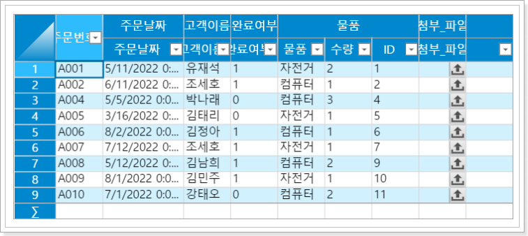 다중 행 헤더 리스트뷰 설정 명령인 Excel로 테이블 내보내기를 사용하면 excel 테이블 이 다중 행 헤더를 지원하지 않으므로 마지막 행 머리만 테이블 열로 내보내집니다.