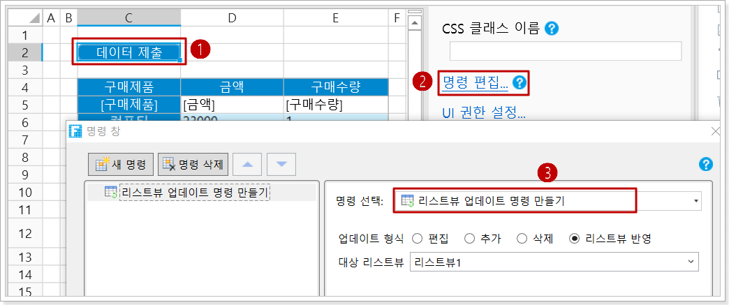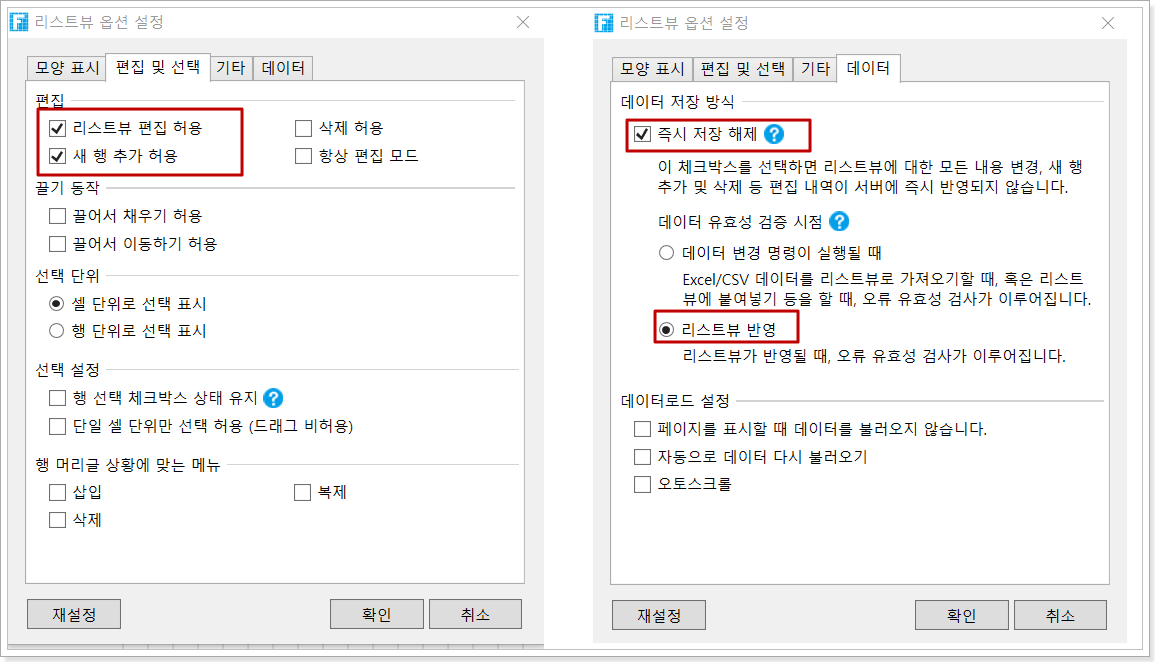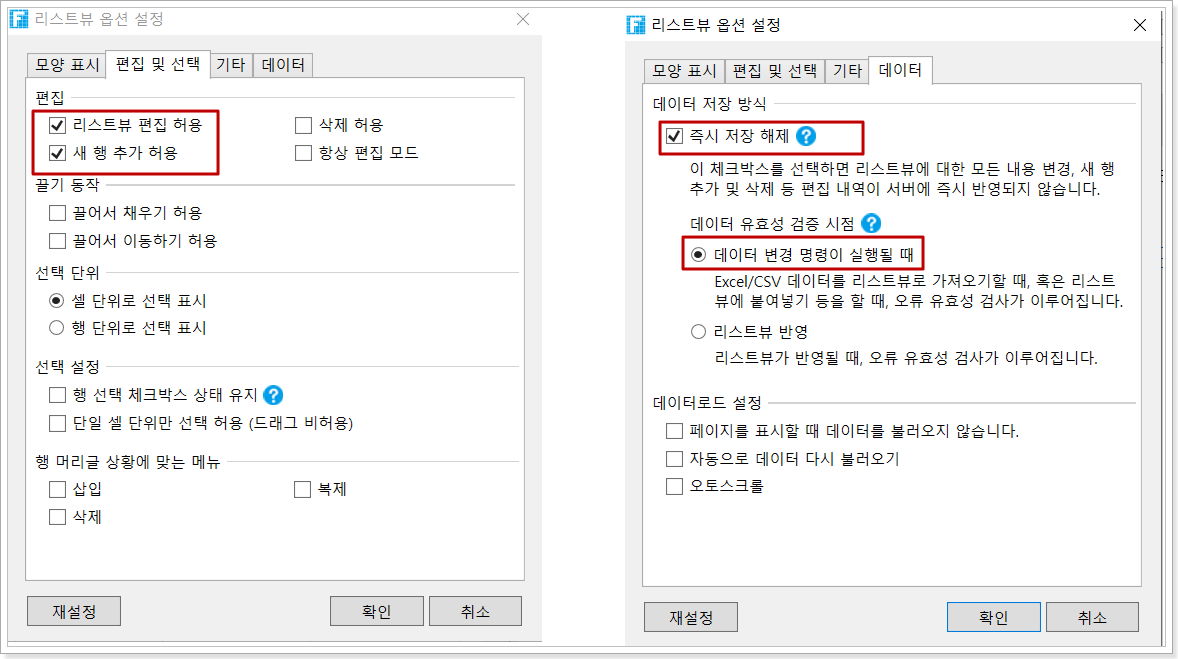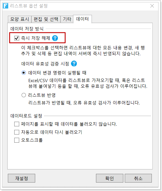 이 시점에서 데이터 작업 명령이 실행될 때와 리스트뷰 데이터가 제출될 때를 포함하여 데이터 유효성 검사 타이밍을 설정할 수 있습니다.